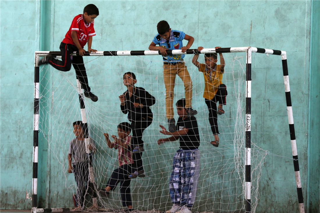 Syrian and Palestinian refugee children climb up a goalpost before the start of a soccer match in the Al-Baqaa Palestinian refugee camp, near Amman on June 17, 2014. The football league between young Syrian and Palestinian refugees and Jordanian youth is organized by Oxfam and the al-Baqaa youth club to commemorate World Refugee Day, which falls on June 20. The matches aim to foster positive relationships between communities, fighting exclusion and marginalization, while promoting trust and friendship, according to the organizer. Photo: CFP