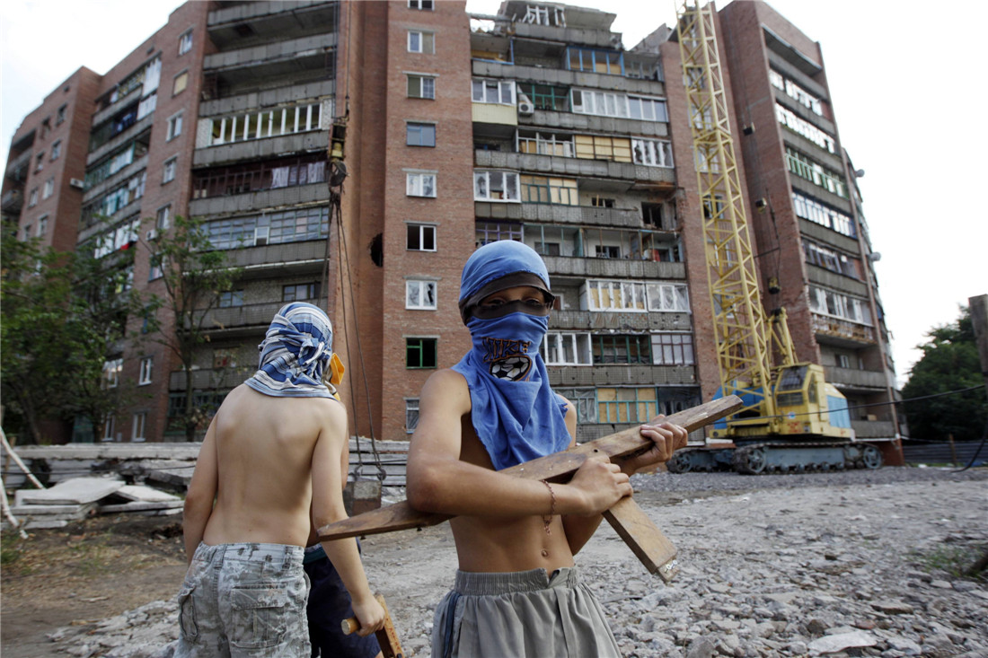 Boys play a game of war between Ukrainian army and pro-Russian armed force in eastern Ukrainian town of Kramatorsk on August 7, 2014. Photo: CFP figcaption >