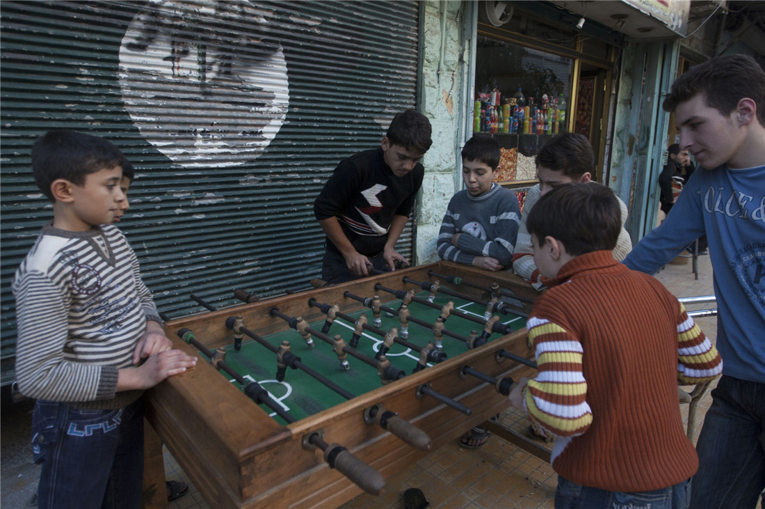 Children play a game of table football in Aleppo's al-Mashhad district on October 22, 2013. Photo: CFP figcaption >