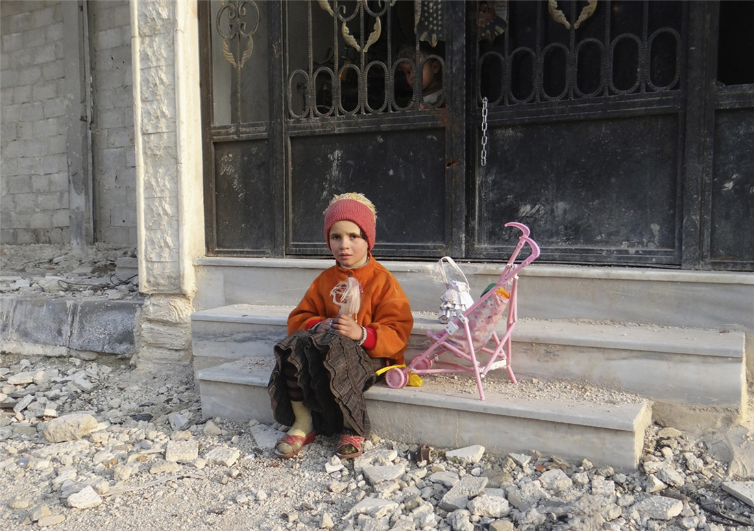 A girl carrying a doll sits on a step of a building as a boy peeks out from its gate in Damascus suburbs of Arbeen on January 6, 2014. Photo: CFP figcaption >
