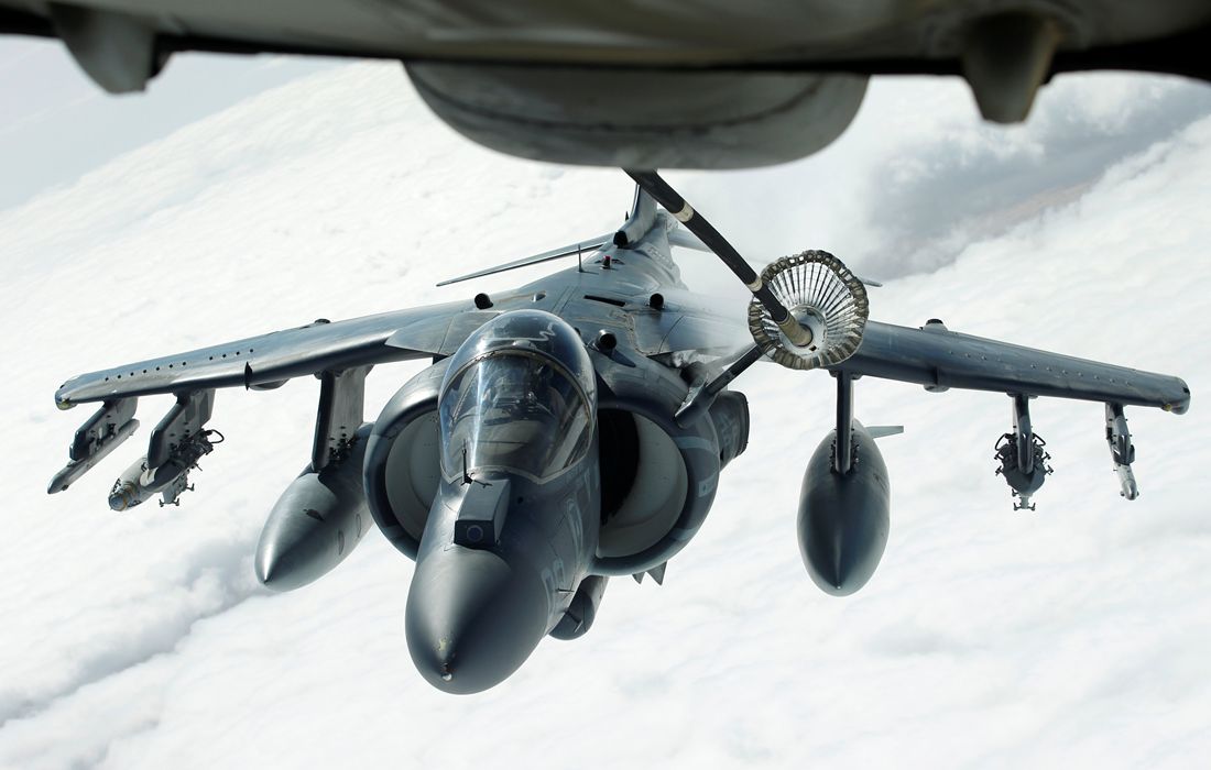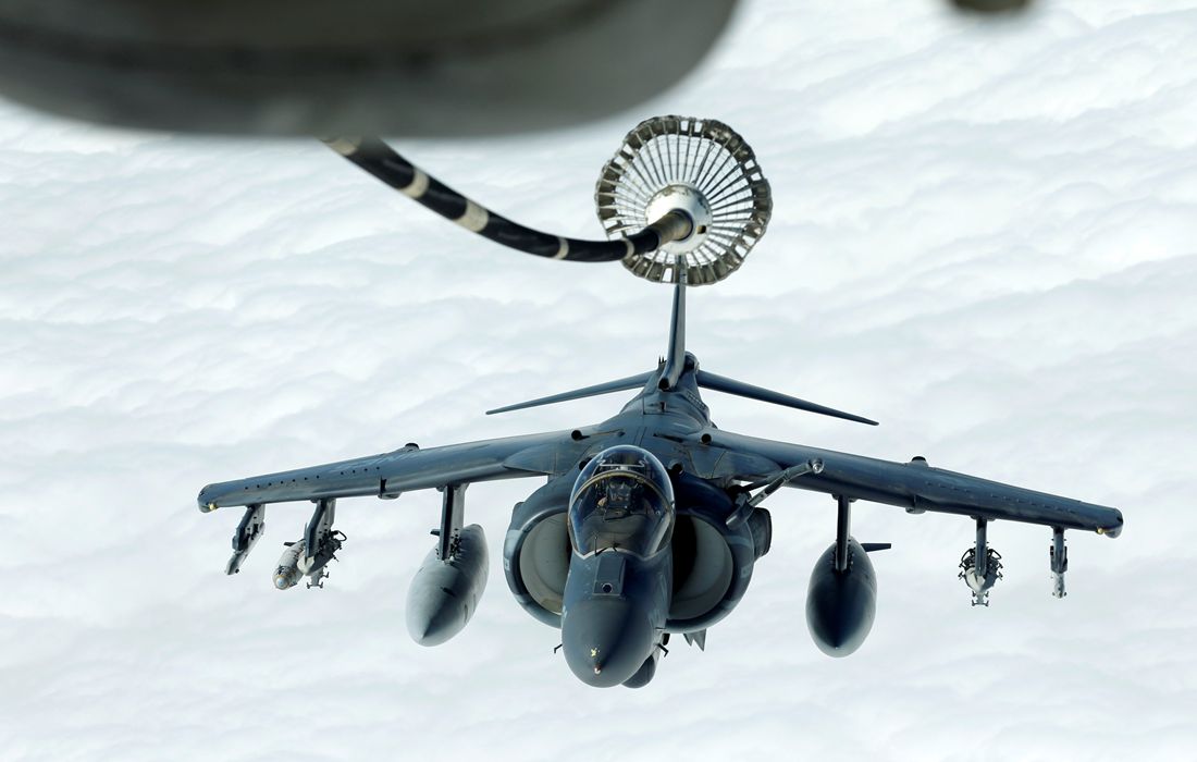 A US Marines Harrier AV-8B is topped off above the clouds thanks to a fuel boom suspended from a US Air Force KC-10 Extender during Operation Inherent Resolve over Iraq and Syria air space on March 15, 2017. Photo: Hamad I Mohammed/CFP figcaption >