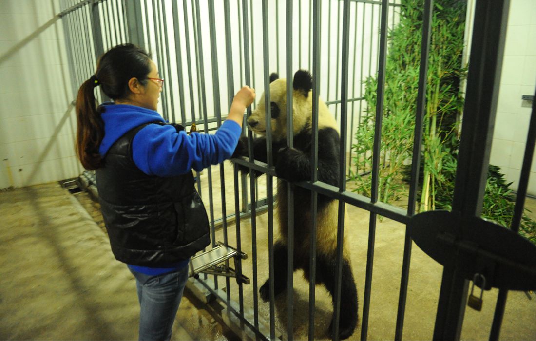A female staff member interacts with giant panda Shulan at the Dujiangyan base of the China Conservation and Research Center for the Giant Panda, the world's only "nursing home" for elderly pandas, on March 16, 2017. Photo: Courtesy of China Conservation and Research Center for the Giant Panda figcaption >