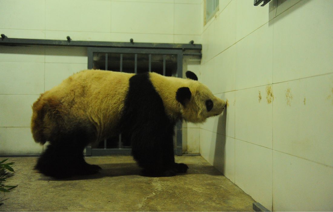 Giant panda Shulan familiarizes itself with its enclosure at the Dujiangyan base of the China Conservation and Research Center for the Giant Panda, the world's only "nursing home" for elderly pandas, on March 16, 2017. Photo: Courtesy of China Conservation and Research Center for the Giant Panda figcaption >