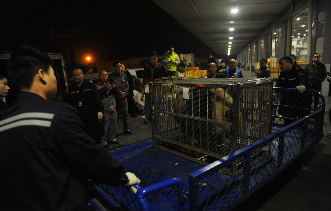 Giant panda Shulan arrives at the Dujiangyan base of the China Conservation and Research Center for the Giant Panda, the world's only "nursing home" for elderly pandas, on March 16, 2017. Photo: Courtesy of China Conservation and Research Center for the Giant Panda figcaption >