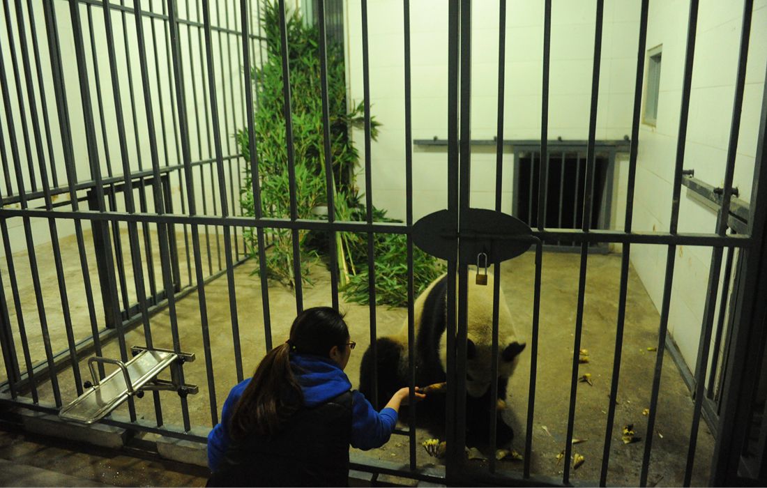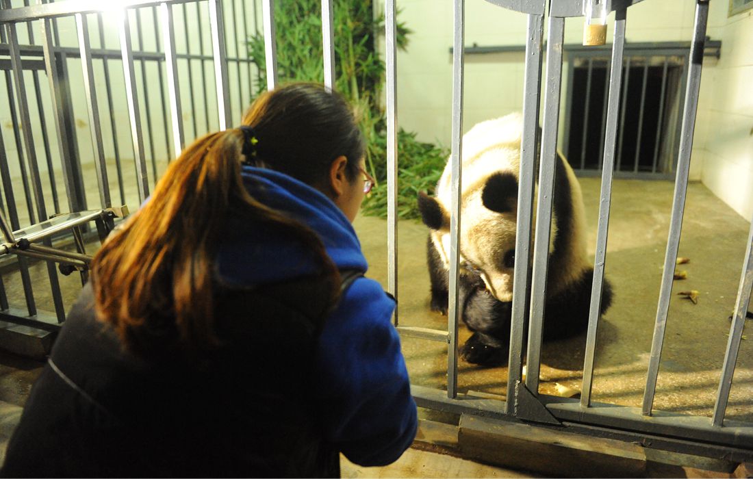 A female staff member observes the behavior of giant panda Shulan at the Dujiangyan base of the China Conservation and Research Center for the Giant Panda, the world's only "nursing home" for elderly pandas, on March 16, 2017. Photo: Courtesy of China Conservation and Research Center for the Giant Panda figcaption >