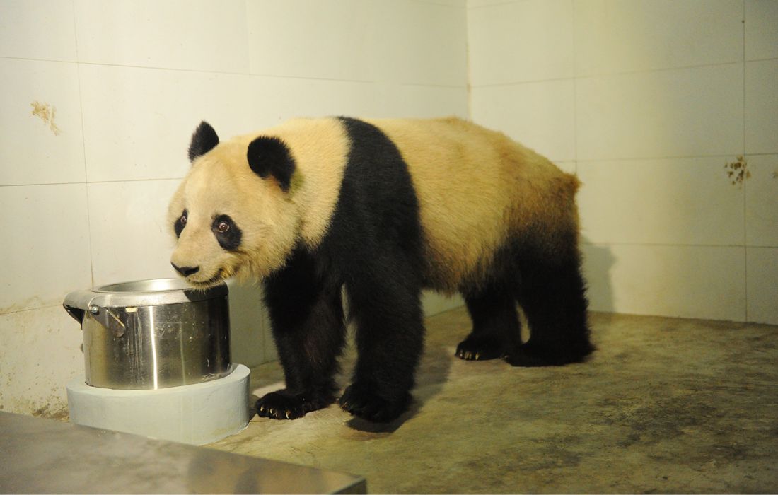 Giant panda Shulan stands in its enclosure at the Dujiangyan base of the China Conservation and Research Center for the Giant Panda, the world's only "nursing home" for elderly pandas, on March 16, 2017. Photo: Courtesy of China Conservation and Research Center for the Giant Panda figcaption >