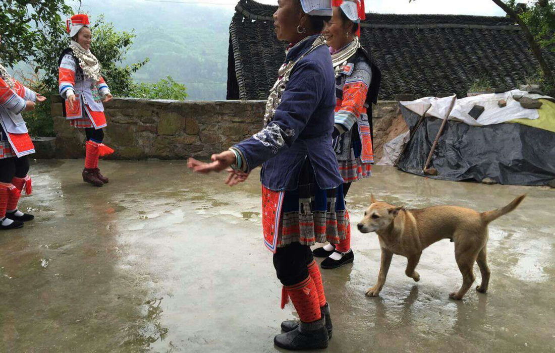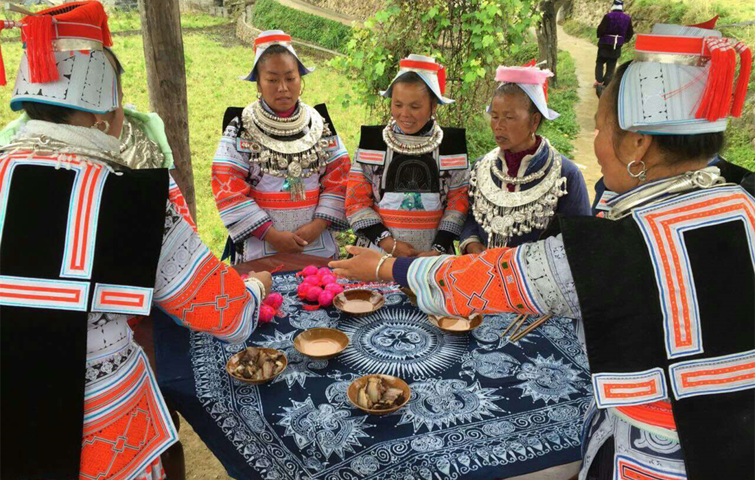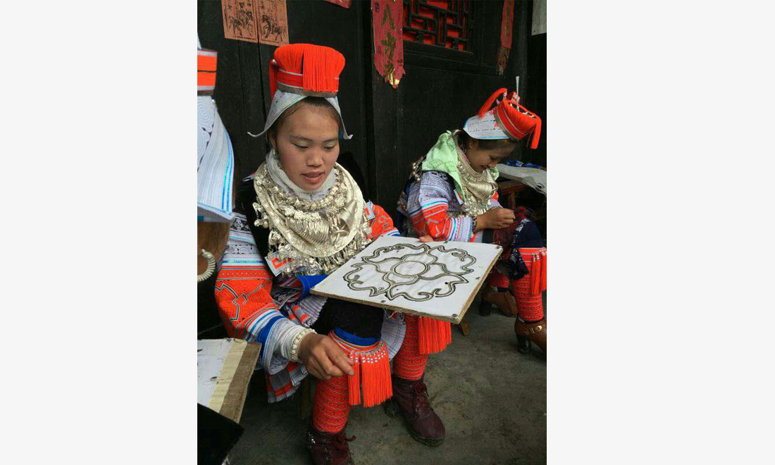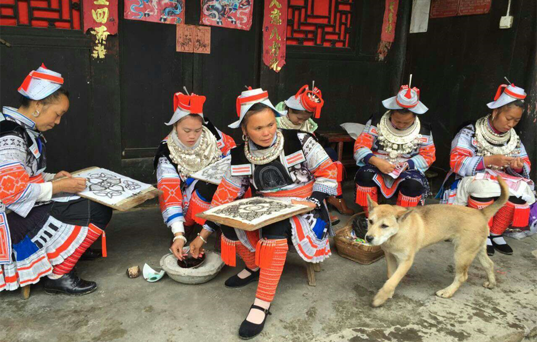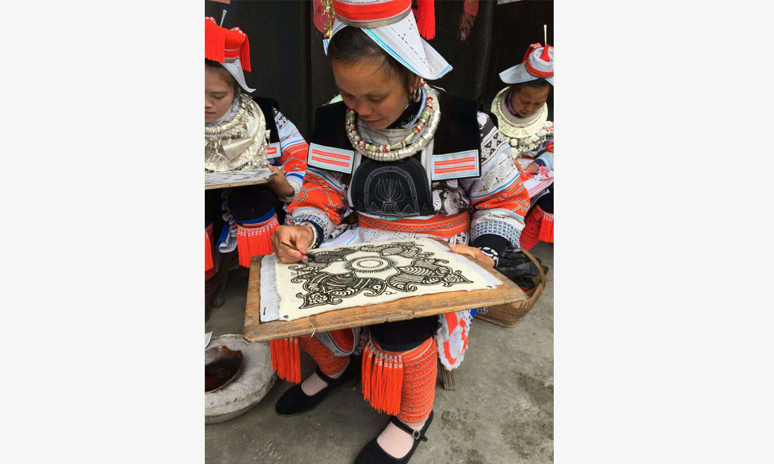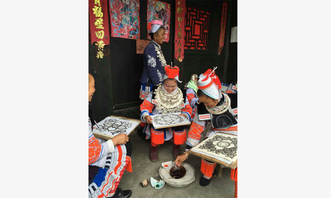 A group of Ge people are painting batik decorated patterns on April 23. Ge people, an ethnic minority group living in Huangping county, Southwest China's Guizhou, is said to be the 57th ethnic minority in China and claimed themselves to be offsprings of Houyi, the mythological Chinese archer. Photo: Xu Liuliu/GT figcaption >