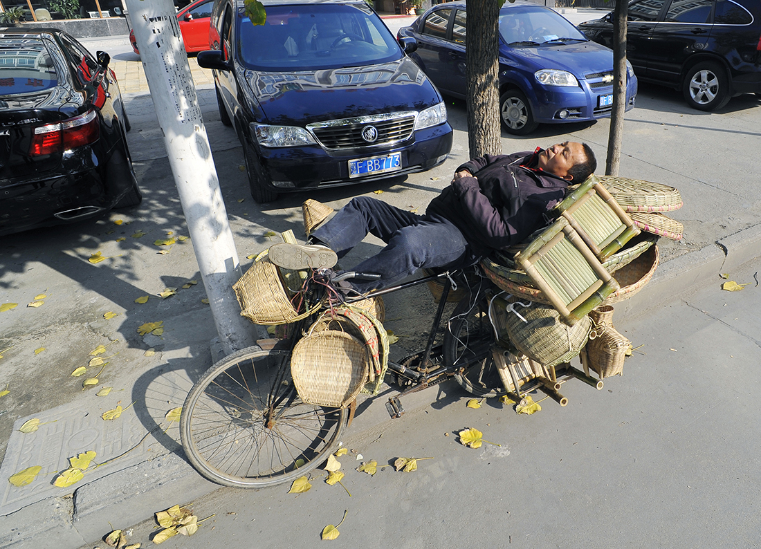 A vendor sleeps on his bike piled high with bamboo products in Xiangyang, Central China’s Hubei Province on November 16, 2010. Photo: CFP figcaption >