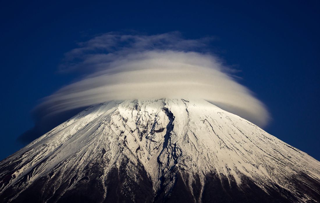 Photographer Akihiro Shibata spots clouds circling the top of Mount Fuji at Yamanashi Prefecture Lake Tanuki, in Fujinomiya, Japan. Photo: Akihiro Shibata/Solent News/ CFP figcaption >