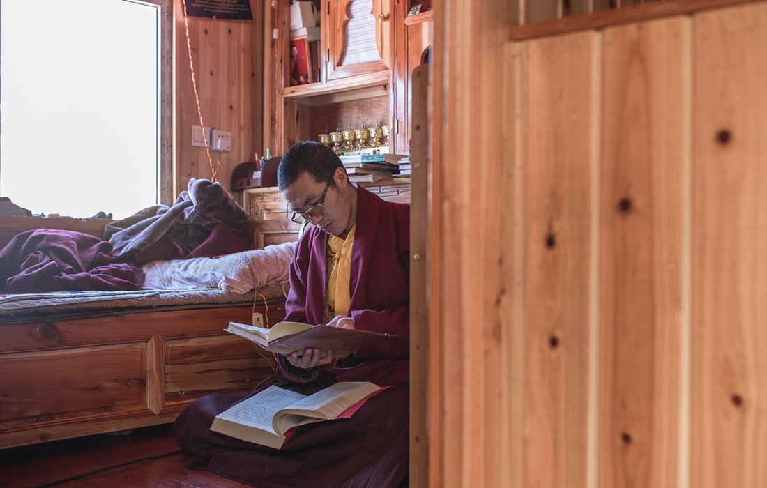 Yongdan Sangbo reads a book in his 6-square-meter room. “I love reading books during my leisure time. I used to take a bus to the town at the bottom of the mountain to buy books, but shopping online makes it much more convenient,” he said. Photo: CFP figcaption >