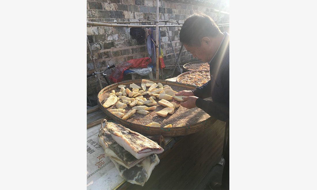 A local man lays out spring bamboo shoots to dry in the sun, before they are stored to be eaten in the winter months. Photo: GT figcaption >
