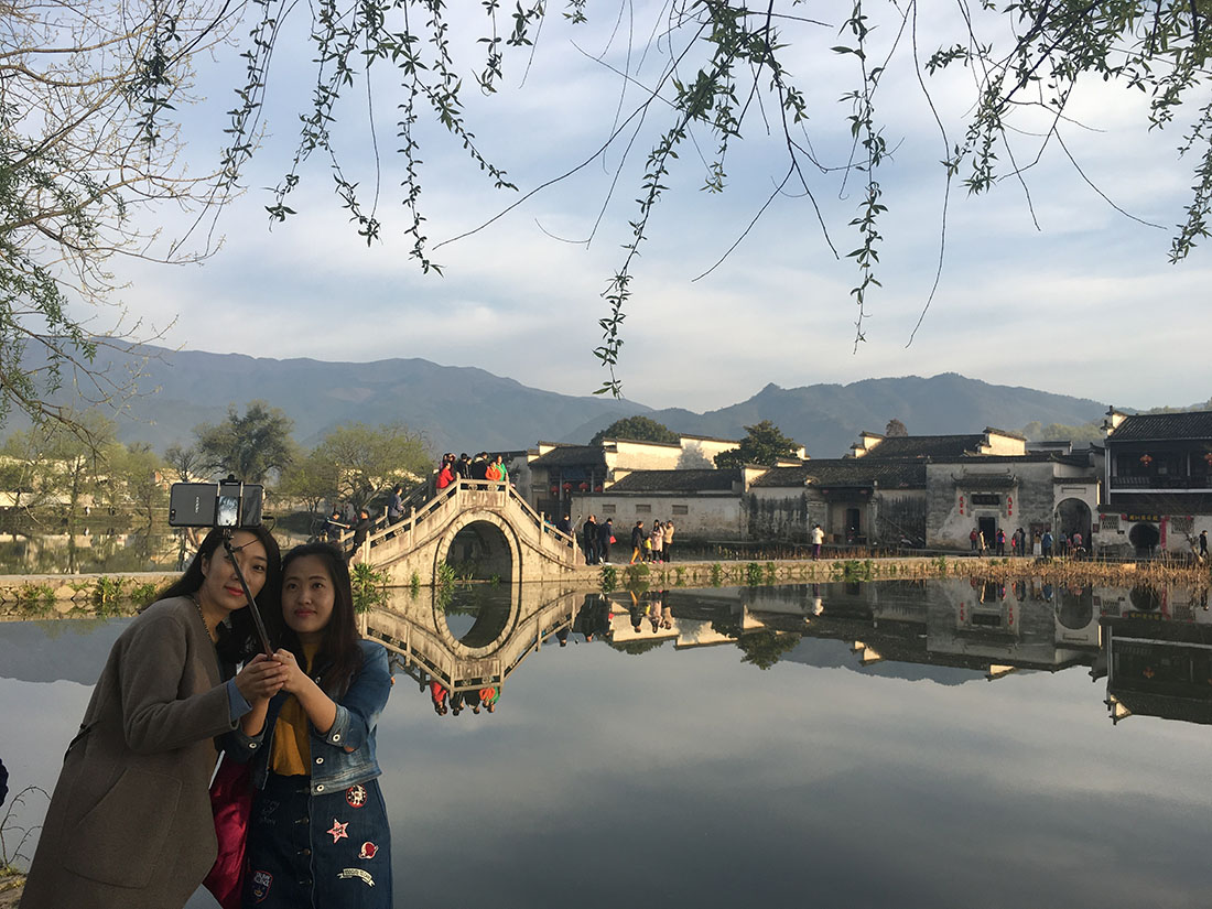 Two young women take a selfie on the shores of Nanhu Lake in Hongcun, Anhui Province on April 3. Photo: GT
