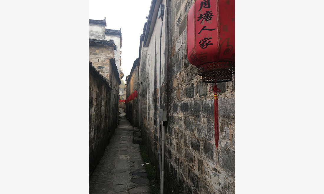 A narrow alley lined with lanterns is seen in Hongcun on April 2.Photo: GT figcaption >