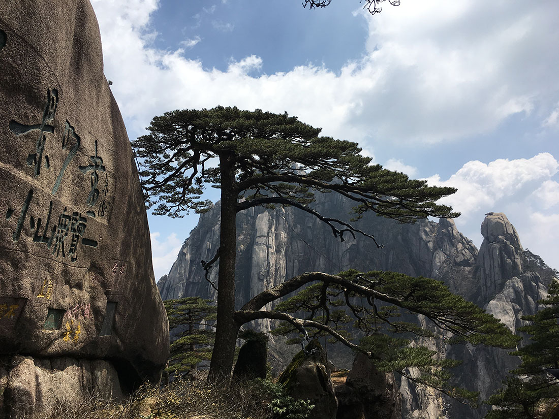 The Greeting Pine stands beside a rock etched with calligraphy on the slopes of Huangshan Mountain. Photo: GT figcaption >