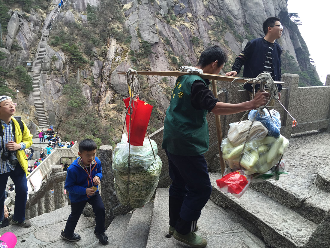 A porter carries goods up the mountain on April 2. Porters are paid 1.50 yuan ($0.22) per 500 grams of goods, while a normal journey takes five to six hours to reach the summit with 50-75 kilograms of cargo in tow. Photo: GT figcaption >