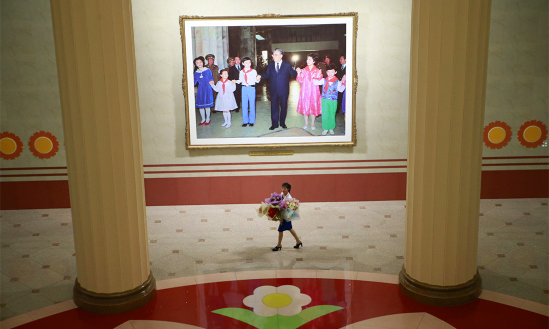 A young girl holding flowers walks past a portrait of North Korean leaders in Pyongyang Mangyongdae Children's Palace on April 14. Photo: Li Hao/GT figcaption >