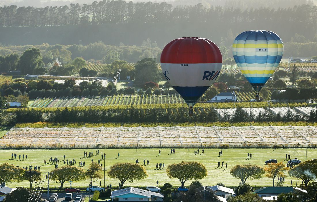 John Holderness in 'Remax' and Kelly Redshaw in 'Fusion' take off during the Meander over Martinborough event at the Wairarapa Balloon Festival on April 16, 2017 in Martinborough, New Zealand. Photo: Hagen Hopkins /Getty Images/CFP figcaption >