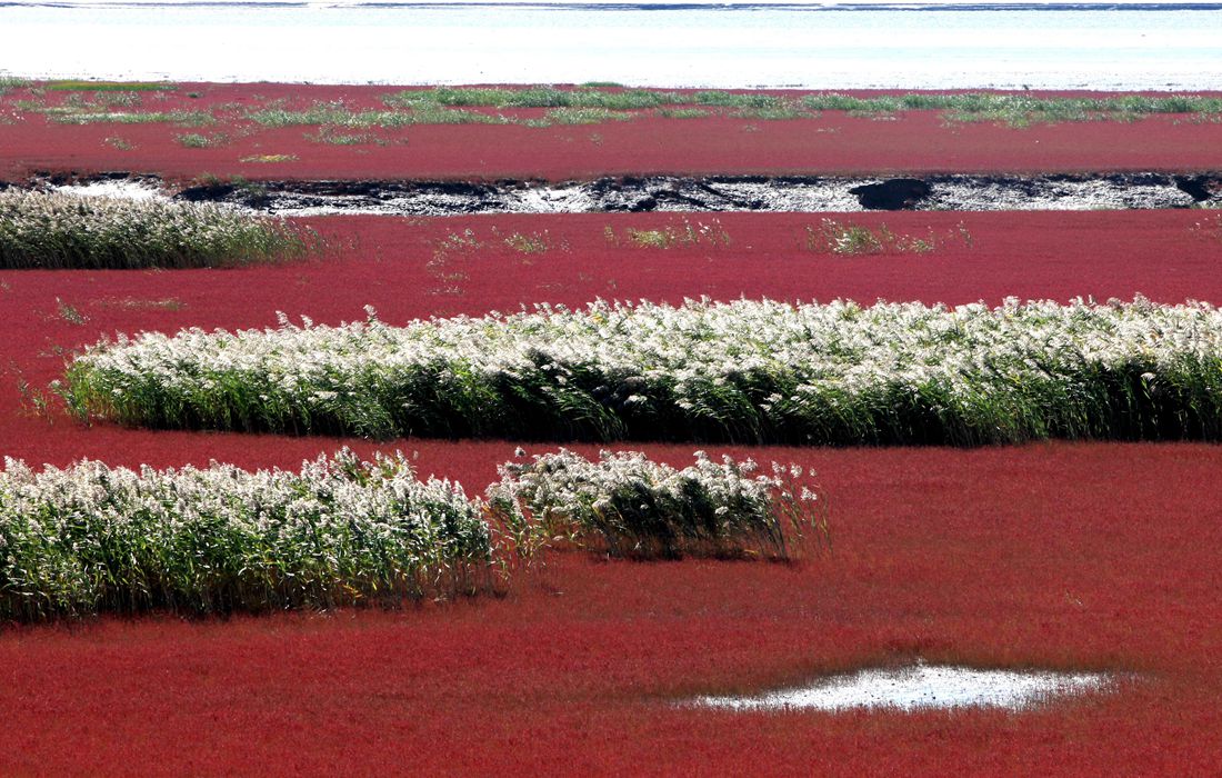 Liaohe River Delta Wetland lies in Northeast China's Liaoning Province. Its weeds turn a stunning red during the autumn months, as if draping a red carpet over the water’s surface. March to April and October to November are the best periods to visit Liaohe River Delta Wetland. Photo: CFP figcaption >