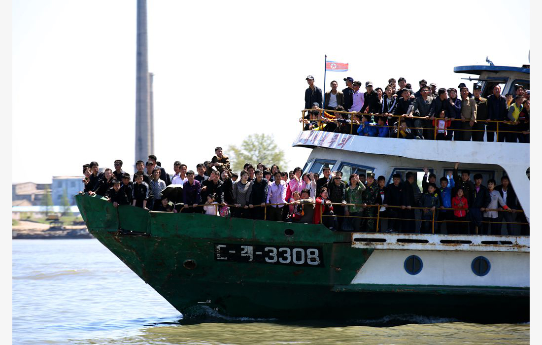 North Korean citizens take a cruise along the Yalu River, which divides China and North Korea, on May 1, 2017. Photo: CFP figcaption >