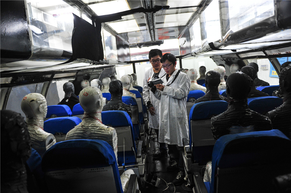 A research team from Tianjin University measures air currents in a model C919 cabin in Tianjin on November 2, 2015. figcaption >