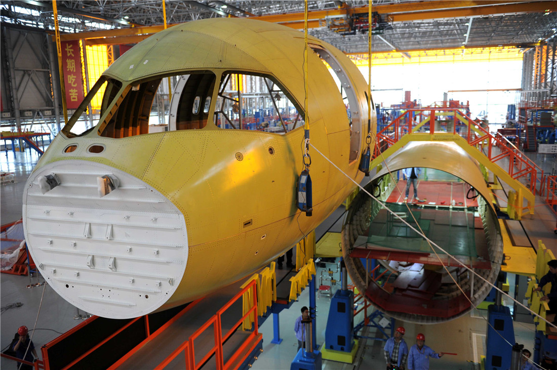 The nose section of the C919 docks with the fuselage in Shanghai on October 16, 2014, marking the beginning of the docking stage. figcaption >