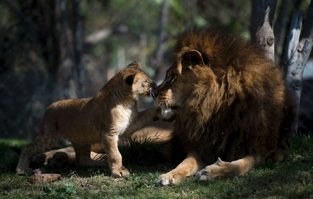 One of the young cubs greets its father Maucho at Buin Zoo, 40 kilometers south of Santiago, Chile. Photo: Martin Bernetti/ CFP figcaption >