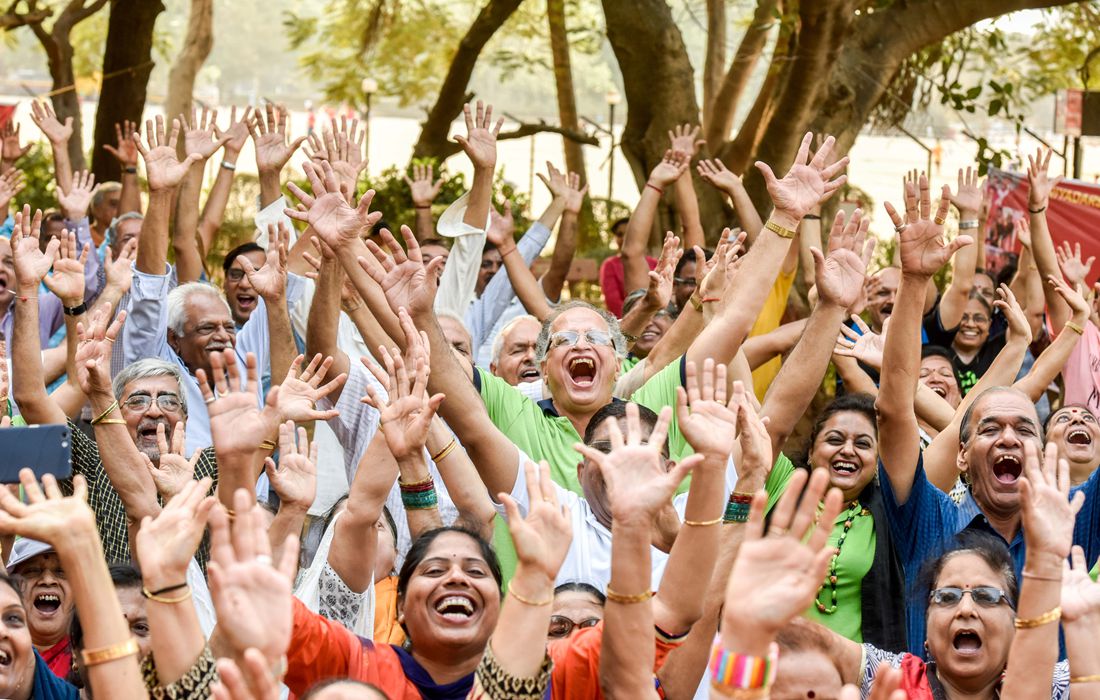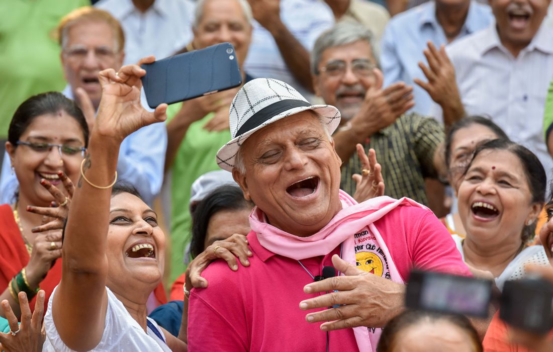 Indians participate in a laughter club gathering as they celebrate World Laughter Day at the Nana Nani Park in Mumbai on May 7, 2017. Photo: Kunal Patil/Hindustan Times/Getty Images /CFP figcaption >