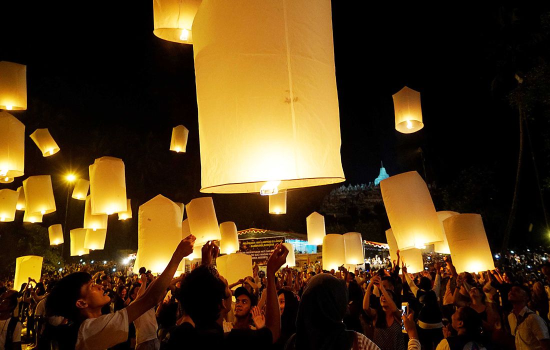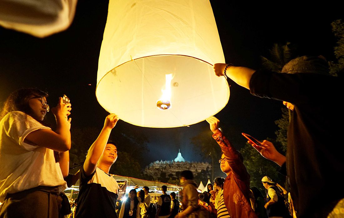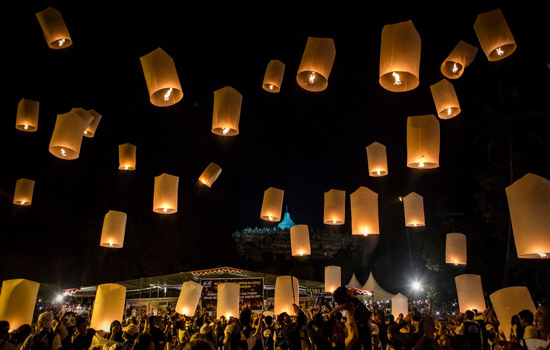 Indonesian Buddhists and tourists release a thousand lanterns during celebrations of Vesak Day at Borobudur Temple on May 10, 2017 in Magelang, Indonesia. Photo: Jefta Images / Barcroft Images/CFP figcaption >