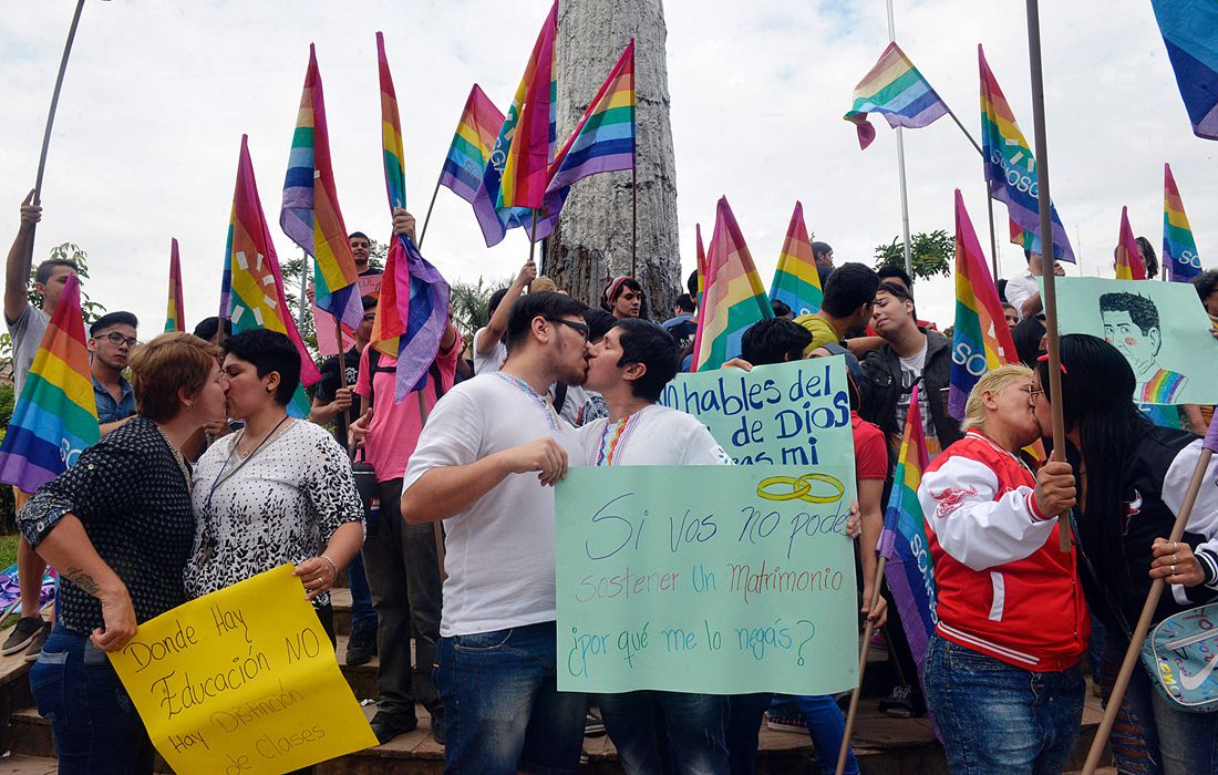 People take part in a "Kissing Marathon" on International Day against Homophobia, Transphobia and Biphobia to draw attention to discrimination against the LGBT (lesbian, gay, bisexual and transgender) community, at the Plaza de Armas square in Asunción, Paraguay on May 17, 2017. Photo: Favio Falcon/CFP