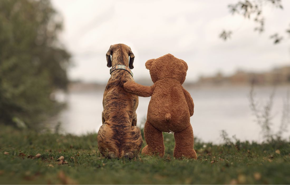 Great Dane Lance looks out across a lake as the brown bear puts a friendly paw on his shoulder. Photo: Andy Seliverstoff/Solent News/CFP figcaption >