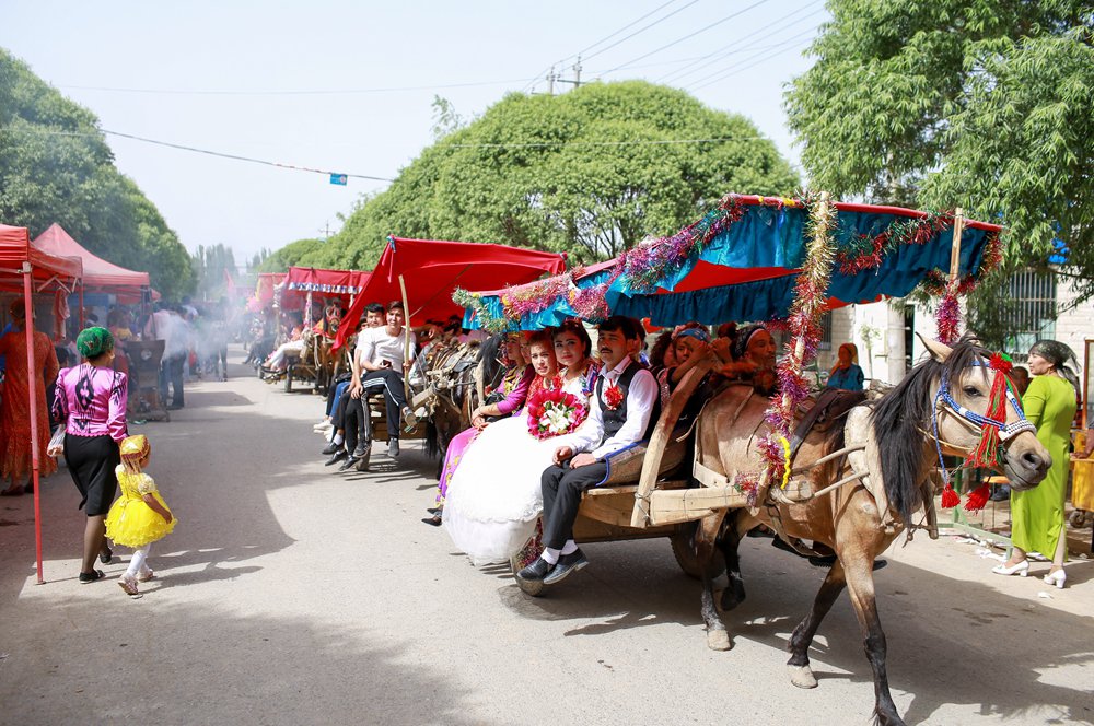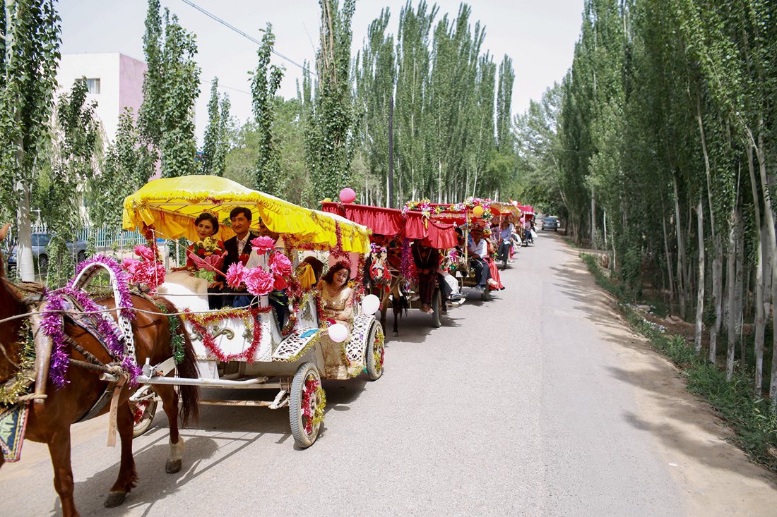 Thirteen newlywed couples ride in horse-drawn carriages with relatives, friends and dancers during a group wedding celebration in Kuqa county, Xinjiang Uyghur Autonomous Region on May 23. Photo: CFP