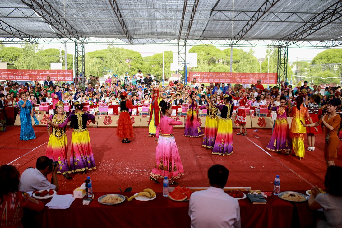 Locals dance in traditional costumes during the wedding celebration in Kuqa county, Xinjiang on May 23. Photo: CFP figcaption >