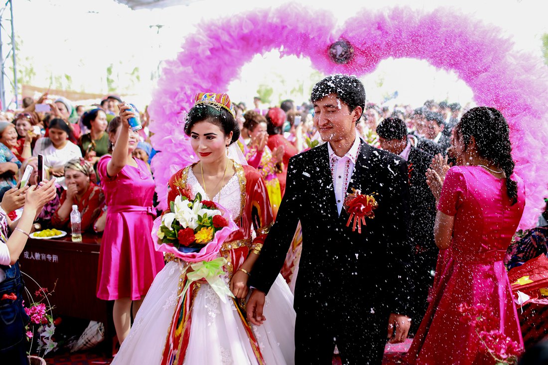 A couple walks down the aisle to the cheers of friends and relatives in Kuqa county, Xinjiang on May 23. Photo: CFP figcaption >