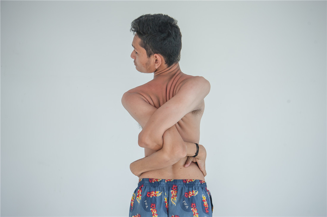 Yash Shah twists and interlocks his arms to show his flexibility in Surat, India on May 2, 2017. Photo: CFP figcaption >