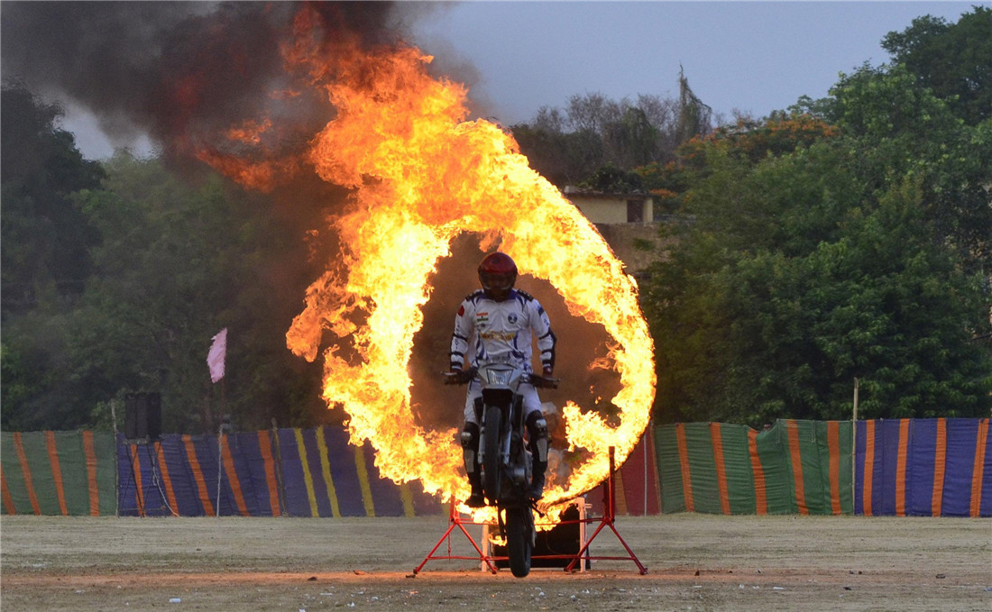 A daredevil from the Indian Army jumps through a ring of fire on a motorcycle during a stunt performance in Allahabad, India on May 30, 2017. Photo: CFP