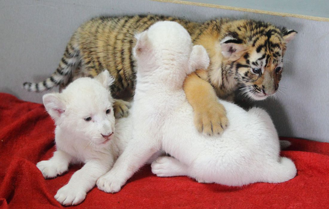 A Siberian Tiger cub plays with two White Lion cubs at Hangzhou Safari Park in Hangzhou, East China's Zhejiang Province on May 31, 2014. Photo: CFP