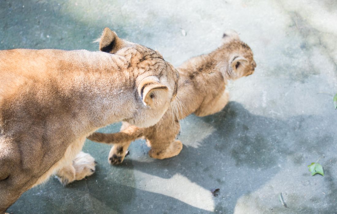 Lion cub Simba walks with its mother at Hangzhou zoo in Hangzhou, East China's Zhejiang Province on November 26, 2015. Photo: CFP figcaption >