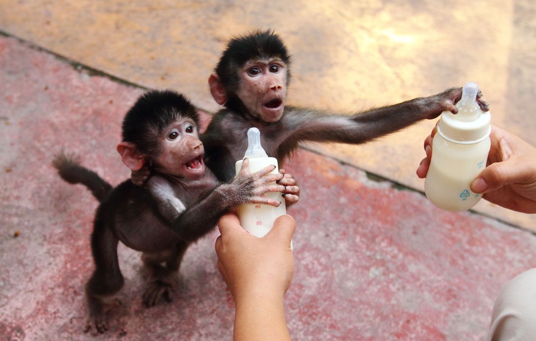 Cute baby Hamadryas Baboons try to get the milk bottles that a zookeeper is holding at Hangzhou Safari Park in Hangzhou, East China's Zhejiang Province on September 17, 2014. Photo: CFP figcaption >