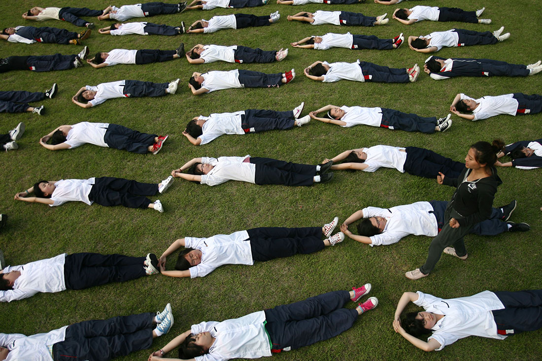 Students perform yoga ahead of Gaokao at a school in Ningbo, Zhejiang Province on June 1, 2010.Photo: VCG figcaption >
