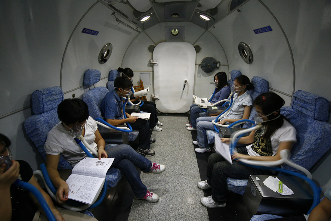 Students take hyperbaric oxygen therapy to reduce the pressure before Gaokao in a hospital in Suining, Sichuan Province on June 4, 2009. Photo: VCG figcaption >