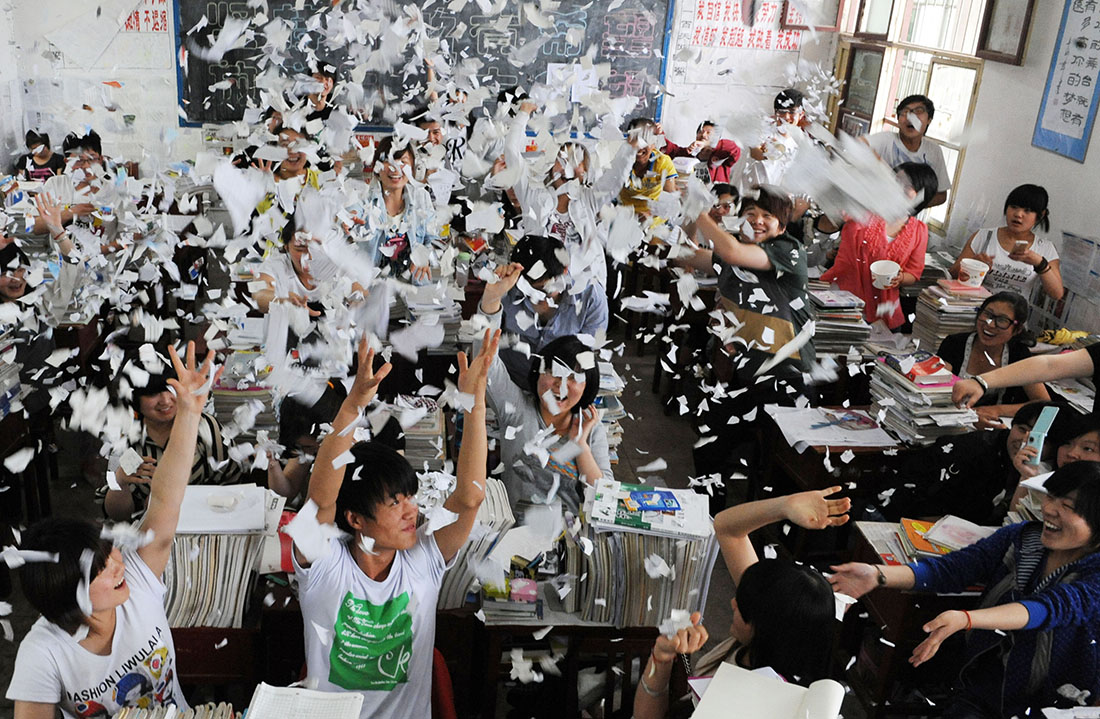 Students throw shredded paper to help themselves feel good ahead of Gaokao in Bozhou, Anhui Province on May 22, 2012. Photo: VCG figcaption >