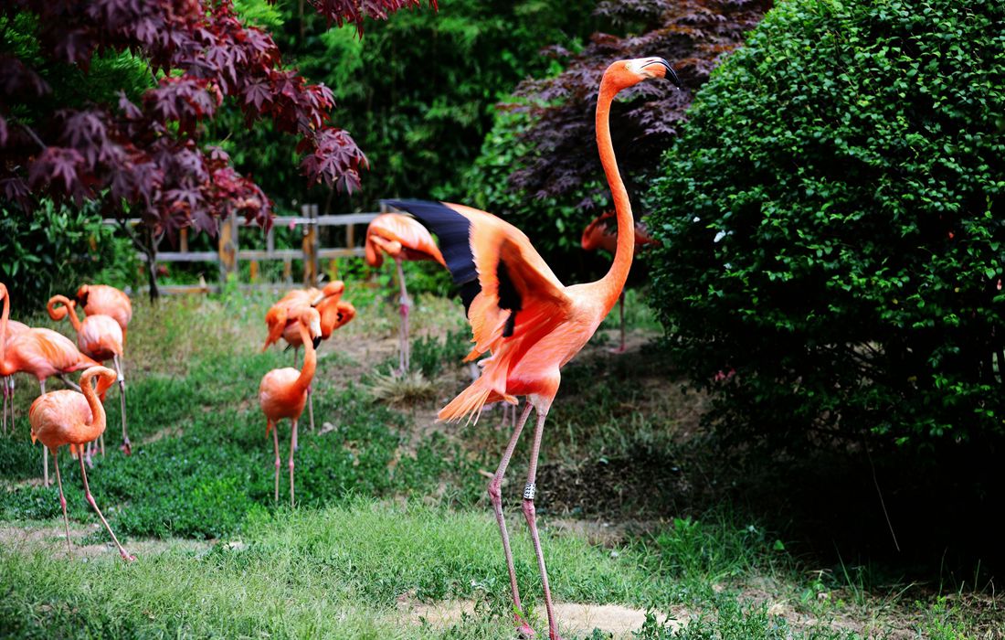 A flamingo spreads its wings in the garden for flamingos at Qingdao Forest Wildlife Park in Qingdao, East China’s Shandong Province on June 1, 2017. Photo: CFP figcaption >