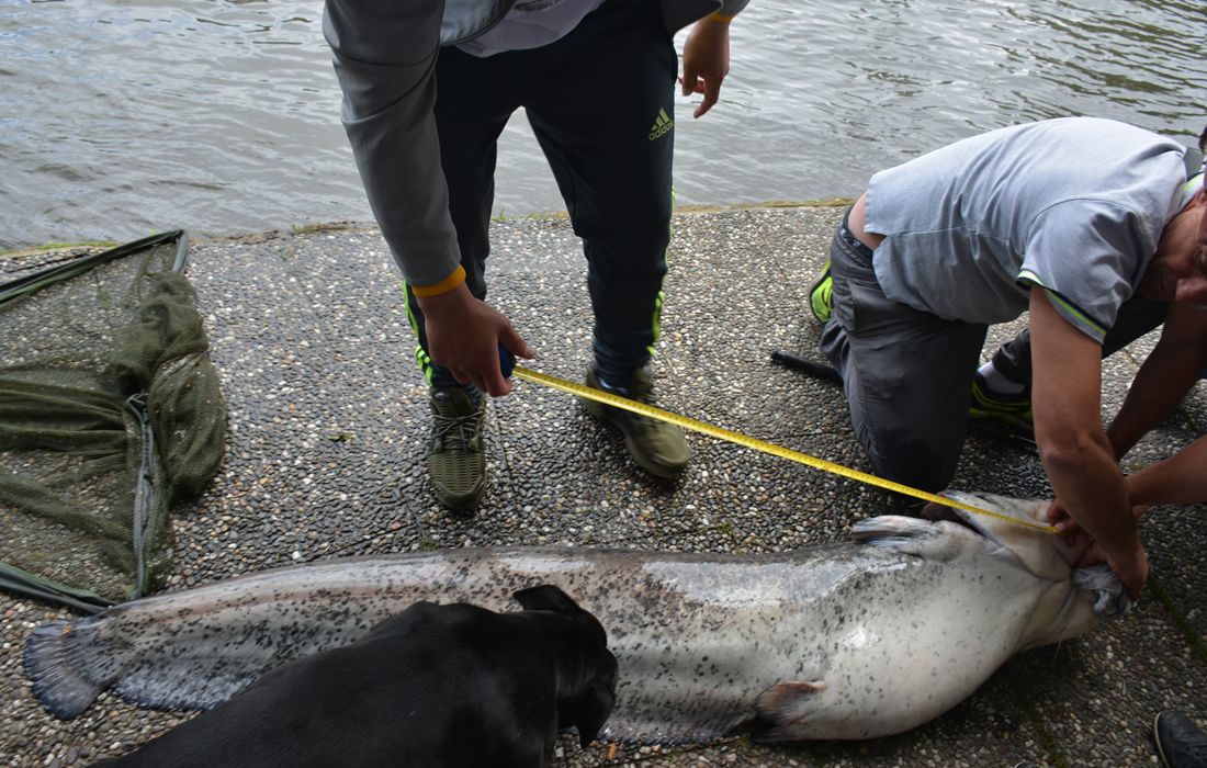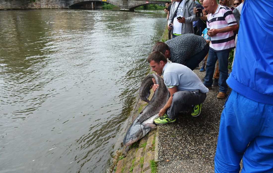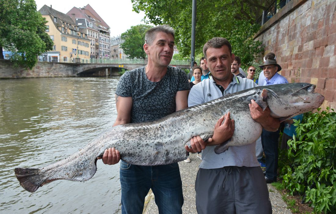 Fisherman Vincent Jopp catches a giant catfish near the famous Wilhelms Church on May 14, 2017 in Strasbourg, France. Photo:Animal Press/Barcroft Images/CFP figcaption >