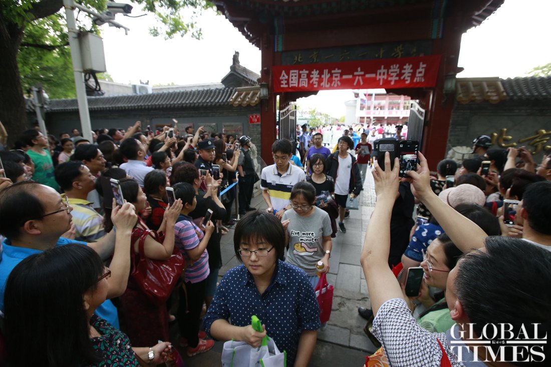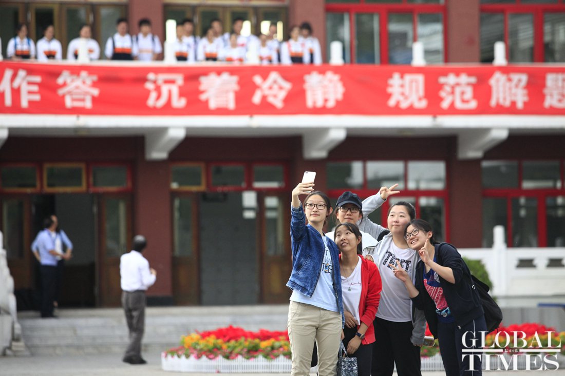 Students take a selfie with their teacher (left) after finishing their last gaokao exam at Beijing No. 161 High School test center on June 8. Photo: Li Hao/GT