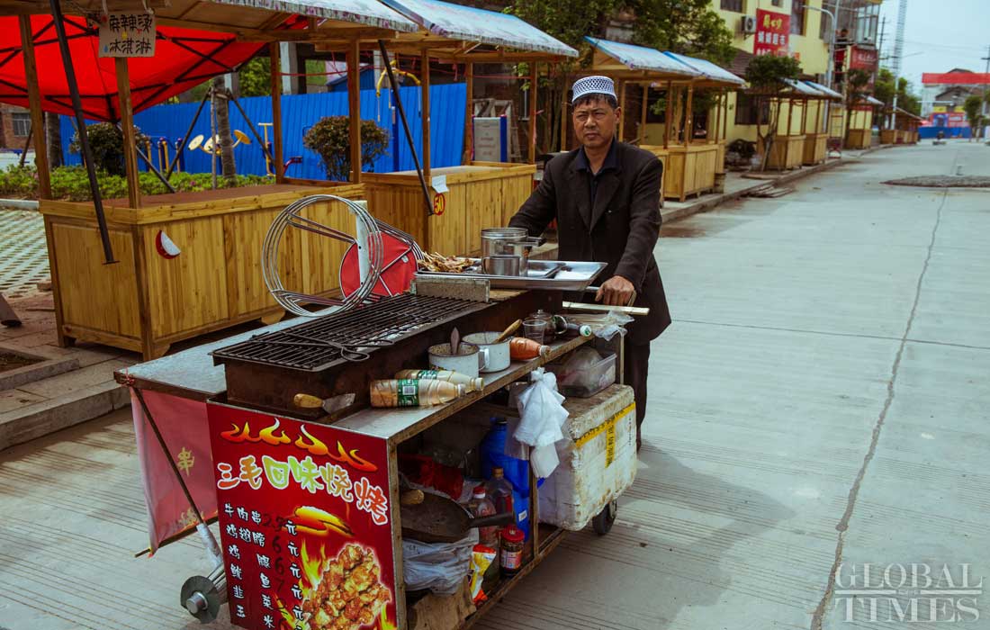 A vendor pushes a food cart at a "national unity" park in Fenshu of Taoyuan county, Hunan Province.
