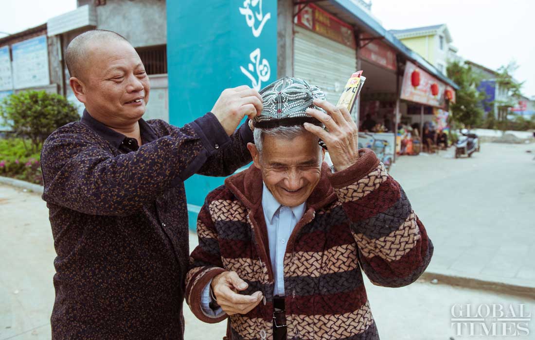 Jian Xiangdang (left) puts a traditional Uyghur hat on the head of his 83-year-old uncle, Jian Yinbao. Elder Jian has been called a “living cultural fossil” among Uyghurs living in Central China. Photo: Li Hao/GT figcaption >