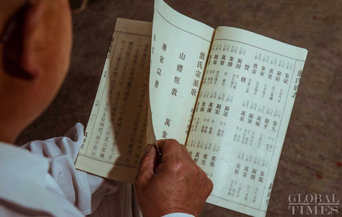 Local resident Jian Xiangdang flips through a book outlining the history of his family compiled in 1996. Jian runs a rural inn in Fengshu.
