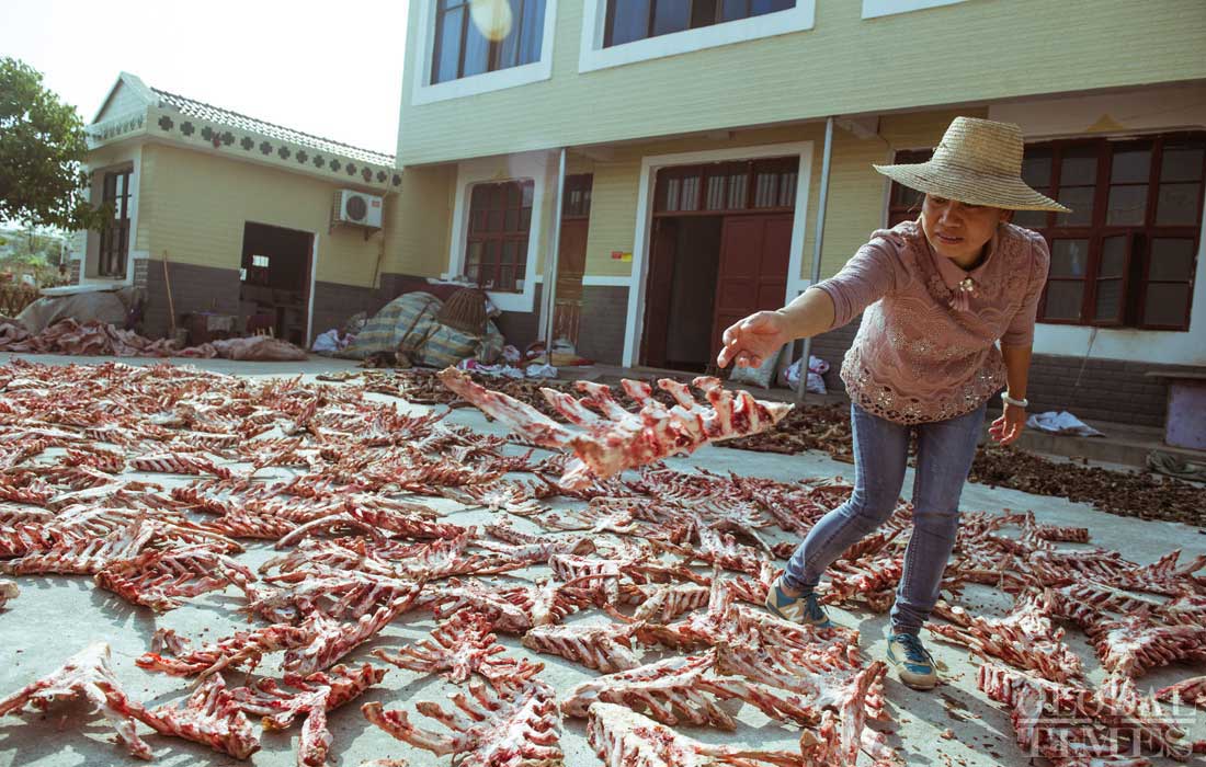 A local woman works to dry beef cartilage in front of her house. The dried cartilage is purchased regularly by local merchants. It is then exported overseas to be used in calcium supplements. Photo: Li Hao/GT figcaption >