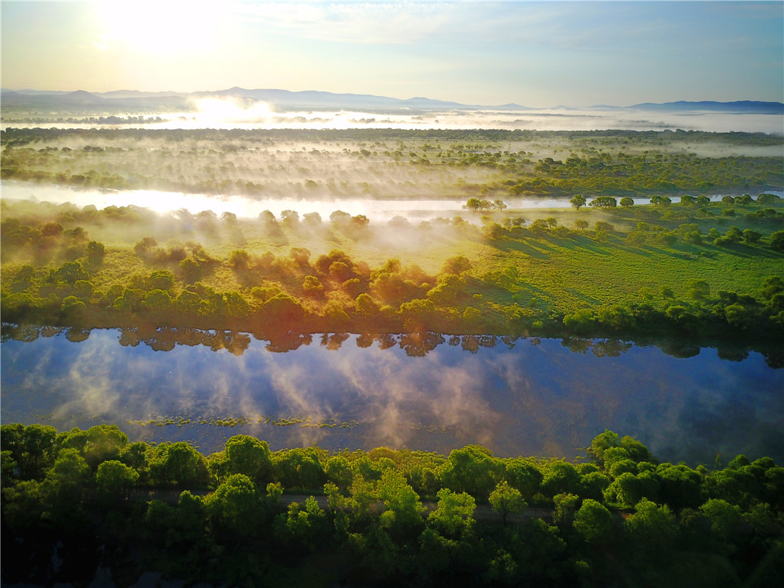The Ussuri River and the nearby wetland lie serenely in the morning mist in Raohe county of Heilongjiang Province on June 16, 2017. Photo: CFP