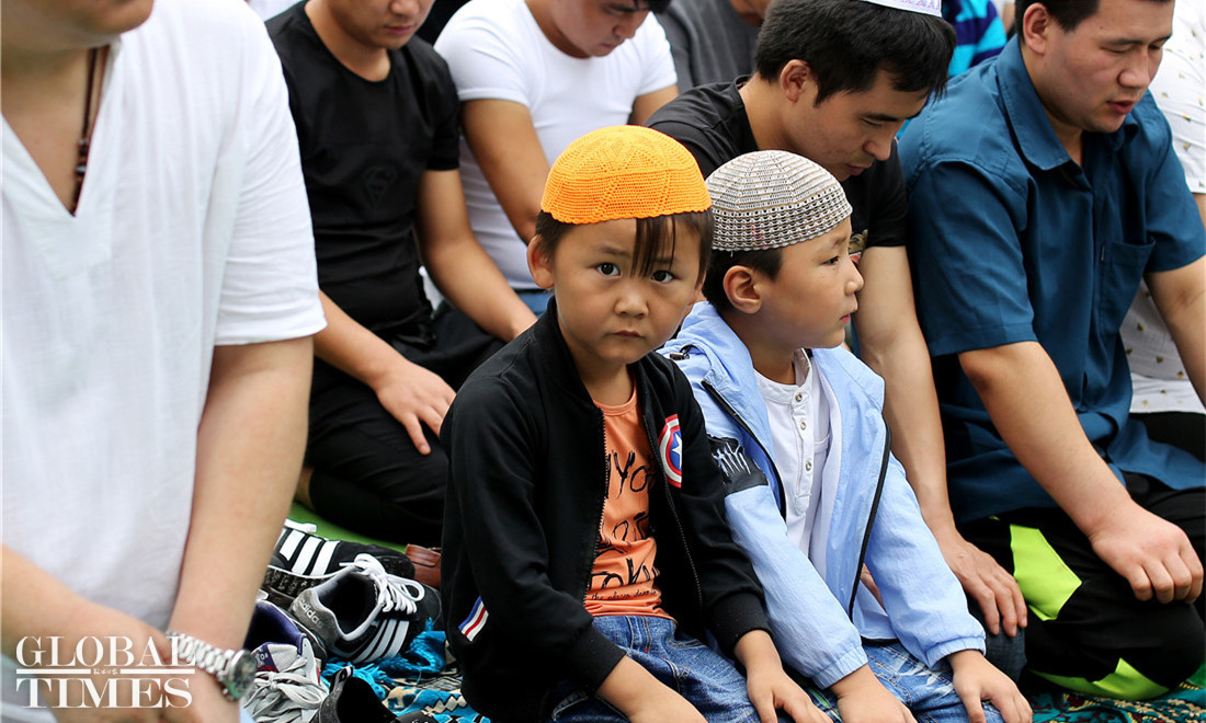 Two Muslim children pray with adults outside of Huxi mosque on Eid al-Fitr. Photo: Yang Hui/GT figcaption >